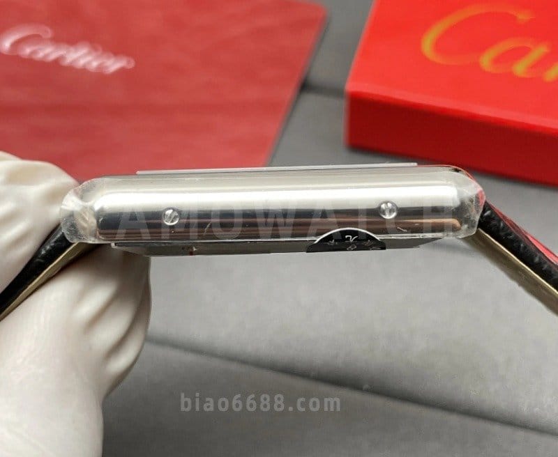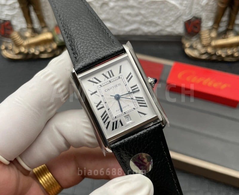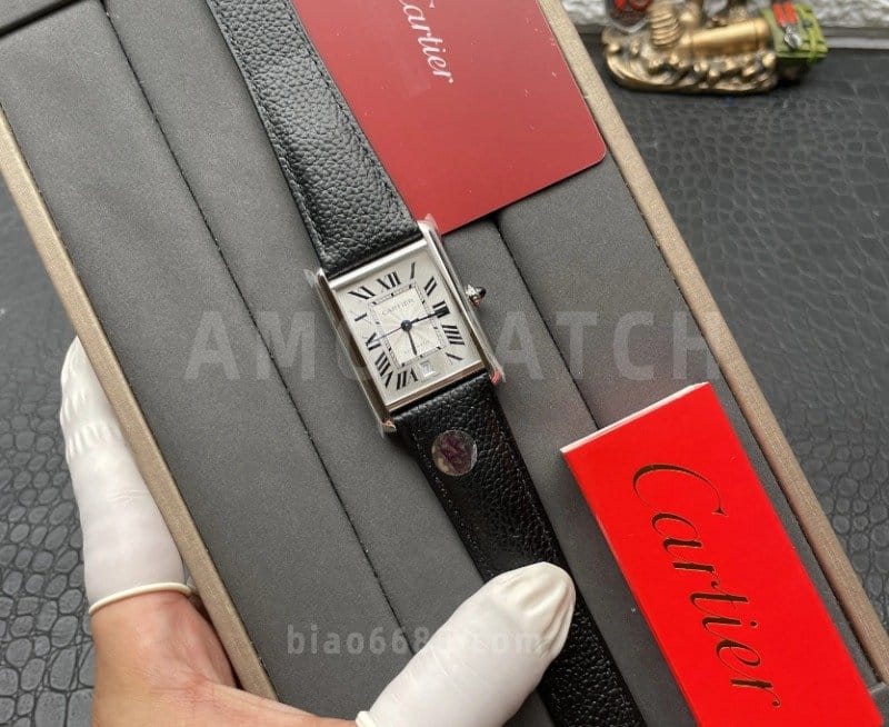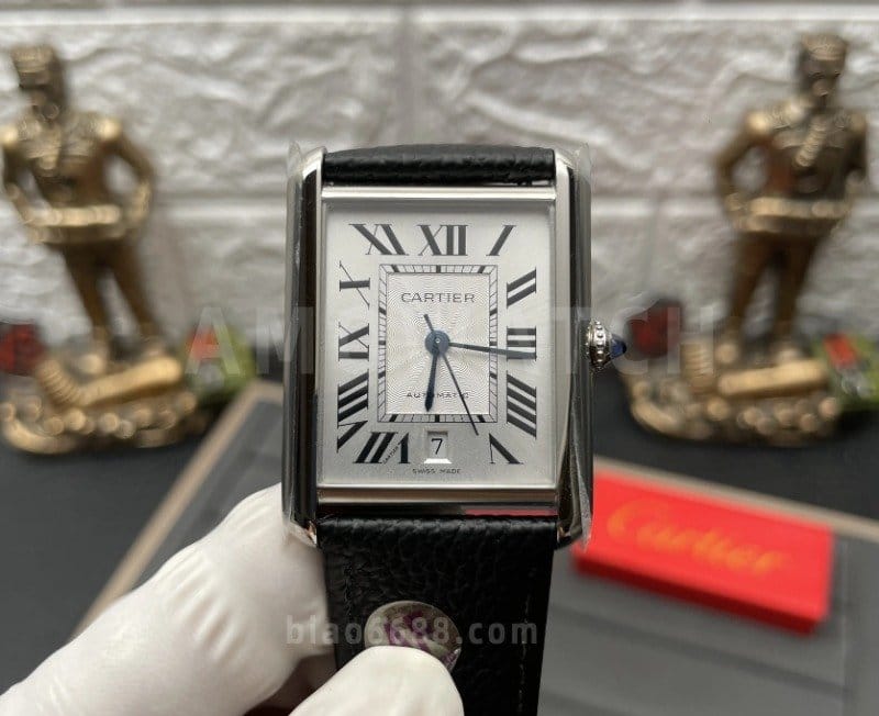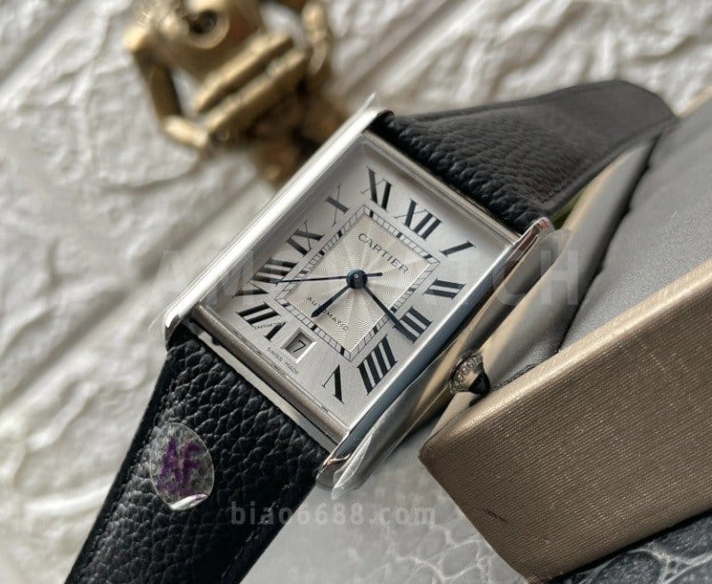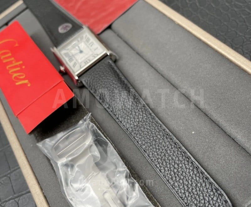 CARTIER 까르띠에 탱크 머스트 오토 스틸 시계 XL 블랙 레더 스트랩