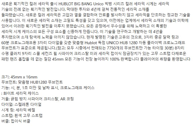 “HUBLOT 위블로 빅뱅 유니코 블루 세라믹 45mm 411.ES.5119.RX”의 첫 상품평을 남겨 주세요